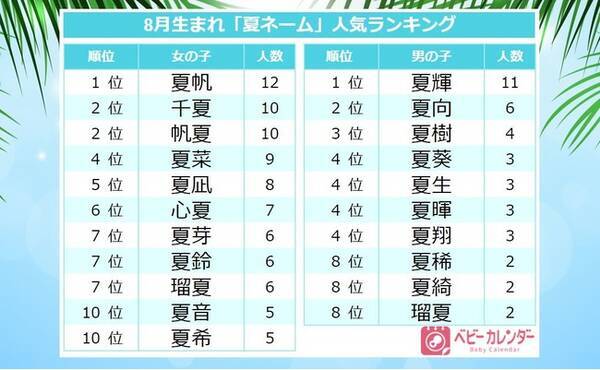 21年 8月生まれベビーの名づけトレンド 発表 2年連続8月人気漢字1位は 夏 夏帆 夏輝 など夏を感じる 夏ネーム が急増していた 21年9月7日 エキサイトニュース